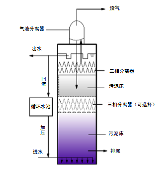EGSB反應器在結構及運行特點上集UASB和AFB的特點于一體,具有大顆粒污泥、高水力負荷、高有機負荷等明顯優勢。均有保留較高污泥量。獲得較高有機負荷,保持反應器高處理效率的可能性和運行性。該工藝區別于UASB和AFB的特點: