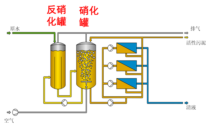反硝(xiao)化/硝(xiao)化罐+外(wai)置式(shi)UF系(xi)統 (MBR)工(gong)藝原(yuan)理圖