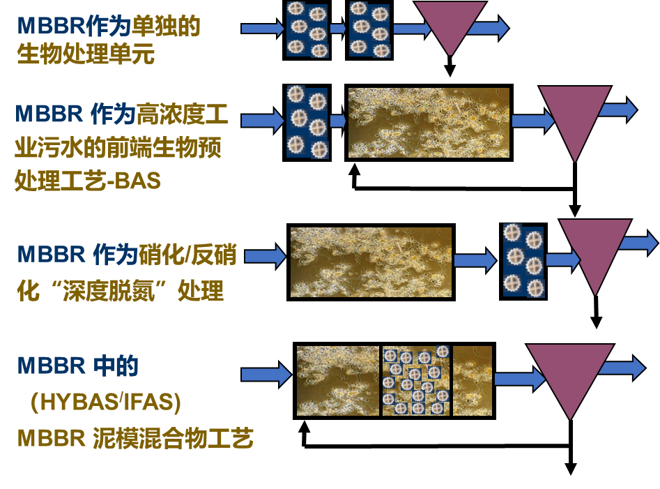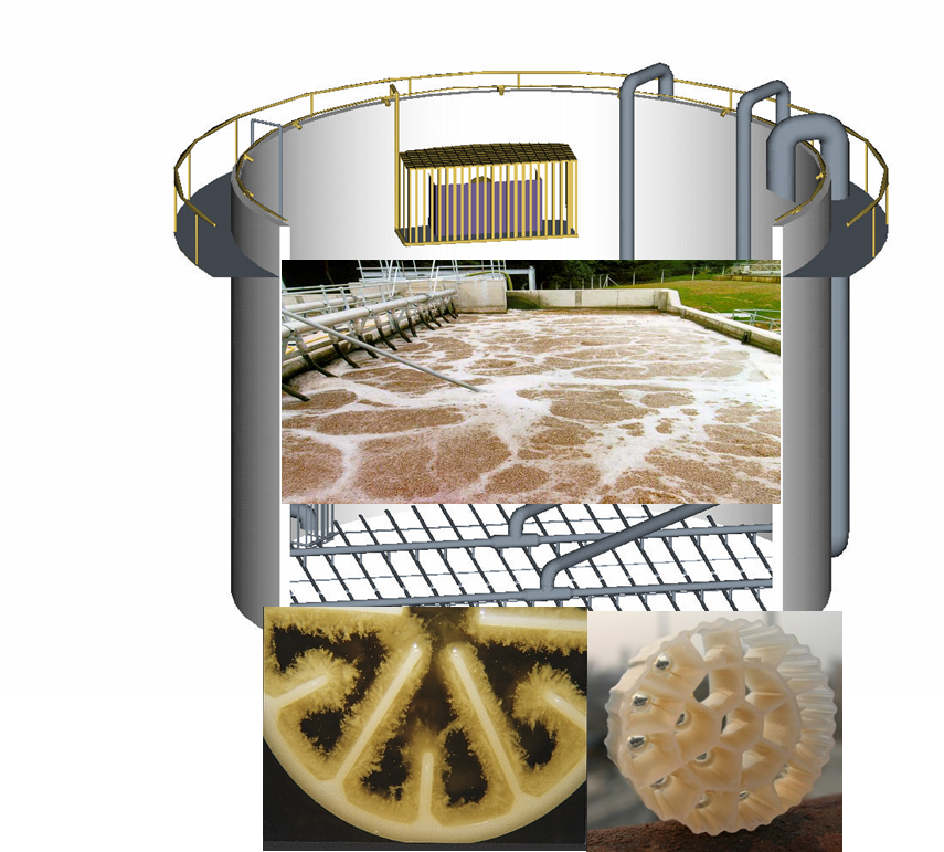 MBBR工藝通(tong)(tong)過向反(fan)應(ying)器中投(tou)加一定(ding)數量(liang)的(de)懸浮填(tian)料(生物(wu)(wu)膜載(zai)體(ti)),在填(tian)料的(de)受(shou)保(bao)護面積上(shang),不同(tong)的(de)微生物(wu)(wu)(從細(xi)菌到纖毛(mao)蟲再到輪蟲)集(ji)中在生物(wu)(wu)膜上(shang)。在載(zai)體(ti)內部生長一些(xie)厭氧菌或兼氧菌,外部為好氧菌。每(mei)個載(zai)體(ti)都是一個微型反(fan)應(ying)器,在好氧處(chu)理(li)系(xi)統中通(tong)(tong)過鼓風曝氣(qi),或者(zhe)在厭氧處(chu)理(li)系(xi)統中通(tong)(tong)過攪拌作用下,保(bao)證廢水與生于(yu)載(zai)體(ti)上(shang)的(de)生物(wu)(wu)膜廣泛而頻繁地接觸。提高系(xi)統傳質效(xiao)率(lv)的(de)同(tong)時,強化生物(wu)(wu)膜微生物(wu)(wu)的(de)更新(xin),保(bao)持(chi)和提高生物(wu)(wu)膜的(de)活(huo)性。